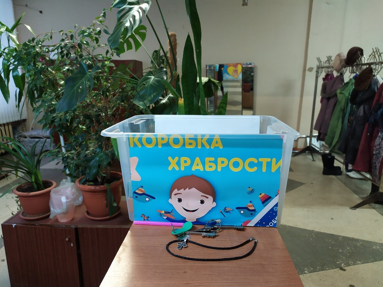 На вахте в здании Центра детского творчества стоит "Коробка храбрости". В нее можно положить любые игрушки или материалы для творчества для детей, которые проходят лечение в Череповецкой детской больнице (сейчас это областная детская больница номер 2).
