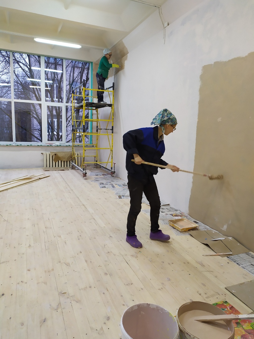 Уже вставлены двери и окна, сделана сцена. Сейчас идут отделочные работы. Силами педагогов ведется покраска стен.